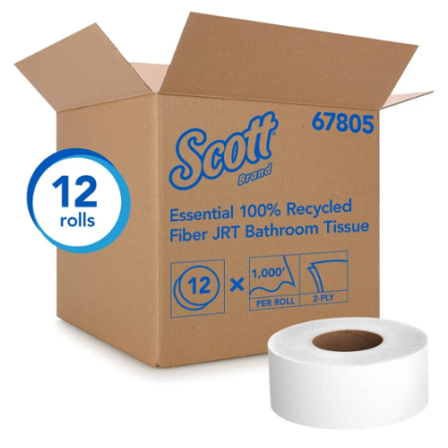 Scott® Essential 100% Recycled Fiber JRT Bathroom Tissue for Business, Septic Safe, 2-Ply, White, 1000 ft, 12 Rolls/Carton