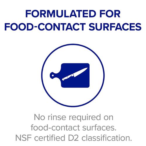 No rinse required even on food-contact surfaces; because there are no precautionary statements and no harsh chemicals, gloves and handwashing are not needed – plus it's safe to use on many hard surfaces
