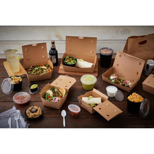 Searching for the perfect alternative to plastic containers? EarthChoice® OneBox® paper boxes help food prep and assembly run smoothly and stay mess-free thanks to a secure front latch closure. Send your to-go orders out with confidence using these easy to close, leak proof, paper containers that come pre-assembled!