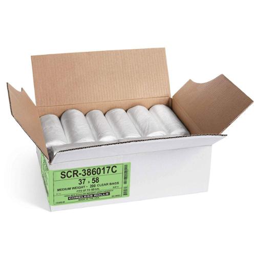 Source Reduction SR Coreless is our preferred Source Reduction line and very popular general stock line of High-Density bags. SR, Material High Density, Capacity 55-60Gal, Width 37 In, Length 58 In, Max Load 62 Lbs, Color CLEAR, Package 200 - 8 Rolls of 25